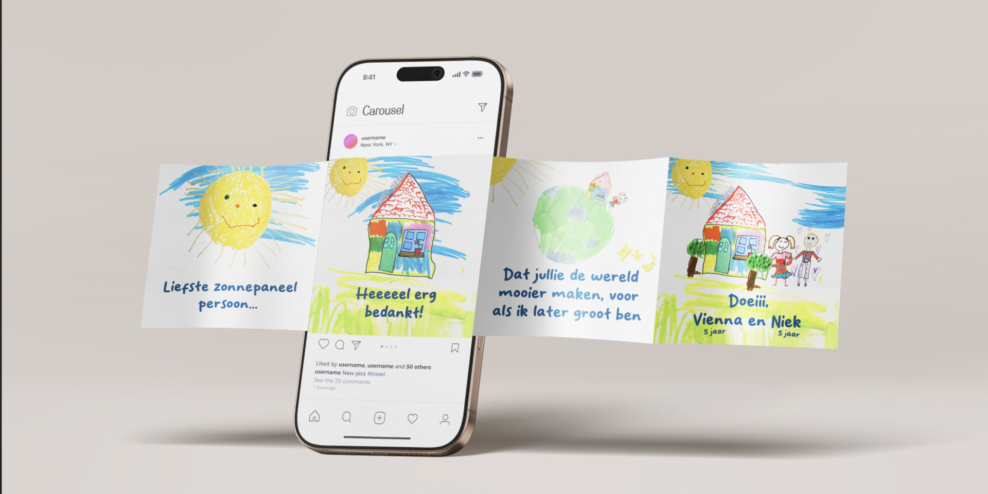 De kern van ons verhaal? Kiezen voor zonne-energie is slim voor je portemonnee, maar de impact is veel groter: het bouwt mee aan een schoon en onafhankelijk Nederland. Om die boodschap echt binnen te laten komen, gaven we het podium aan de daadwerkelijke winnaars: de generatie van de toekomst. Talloze kinderen stuurden prachtige tekeningen en lieve woorden in om zonnepaneeleigenaren te bedanken, wat de campagne een authentieke en emotionele laag gaf.